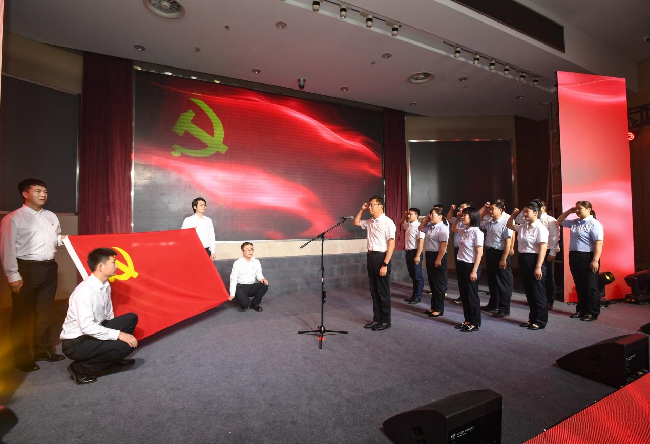 活动现场,,,邵岩向导2023年度新开展党员面向党旗,,,高举右拳、、、手握信心、、、庄重宣誓。。集团党委副书记周斌、、、纪委书记田军划分为2022年度“支部之星”代表颁奖。。