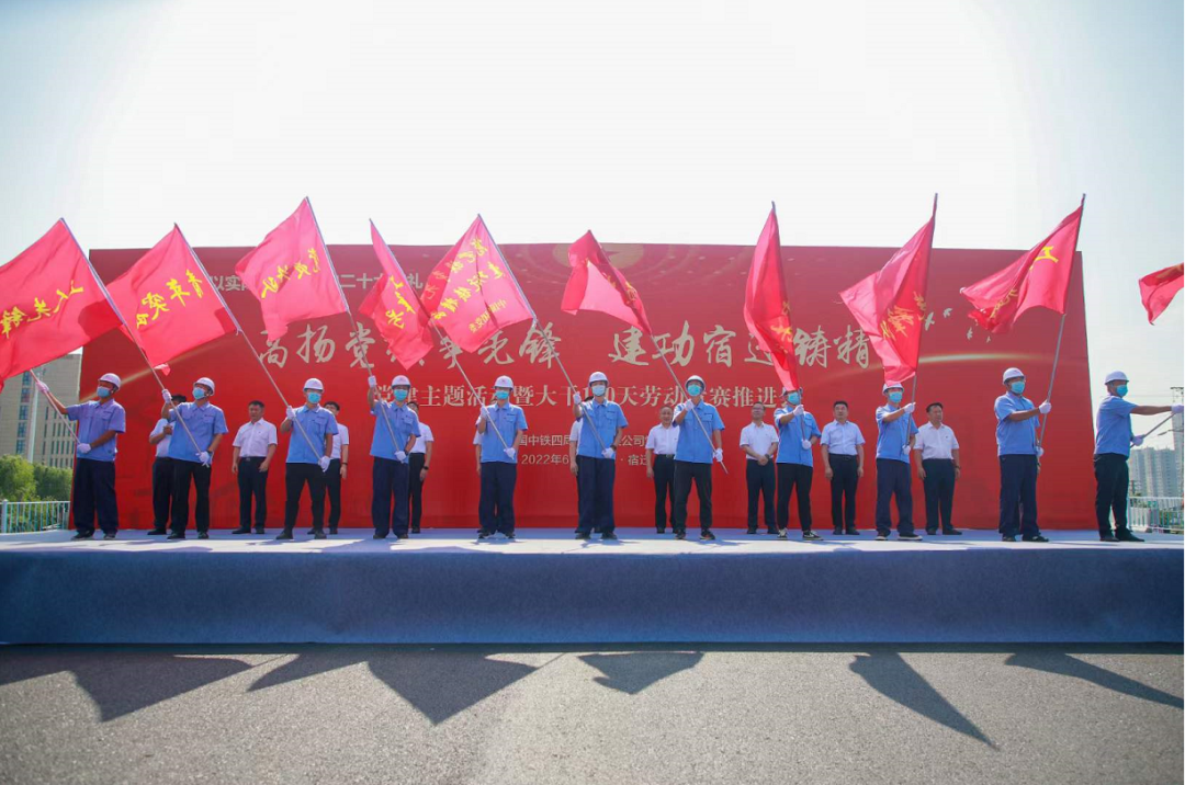 在北京路快速化刷新工程1标段施工现场开展了“高扬党旗争先锋·立功宿迁铸精品”党建主题活动暨大干100天劳动竞赛推进会,,,为项目建设者鼓劲打气,,,牢牢将建设者的心凝聚在一起。。该工程主线高架桥施工基本完成,,,比妄想提前了20多天。。