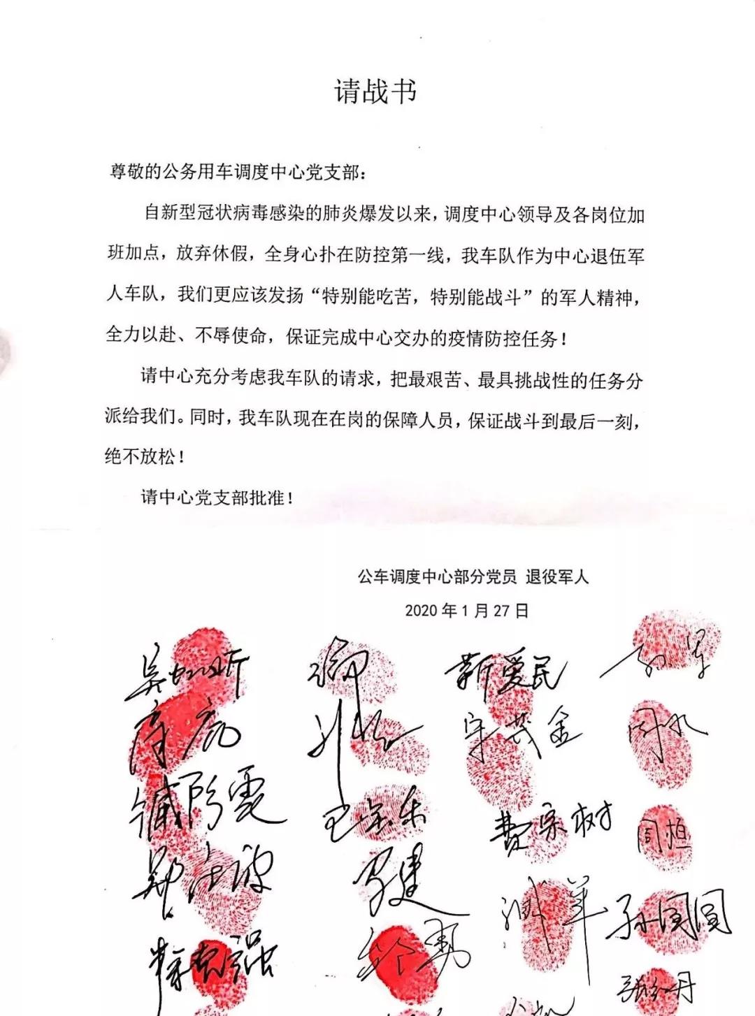 “请把最艰辛、、最具挑战性的使命分配给我们 ,我们肯定全力以赴、、不辱使命 ,包管完成组织交办的各项疫情防控使命” 。1月27日 ,公车调理中心23名党员同志向党支部递交了一份印满红指模的“请战书” ,短短百余字 ,字字铿锵 ,句句深情 。他们中有事情履历富厚的“60后”、、有刚走上事情岗位的“95后”、、有两岁孩童的妈妈、、有备受怙恃痛爱的女儿......但现在 ,面临这场无声的“战争” ,他们不忘自己更是一名党员、、是退役武士、、是勇往直前的“战士” ,他们迫切希望加入党支部的疫情防控党员先锋队 ,为打赢这场疫情防控阻击战孝顺自己的实力 。