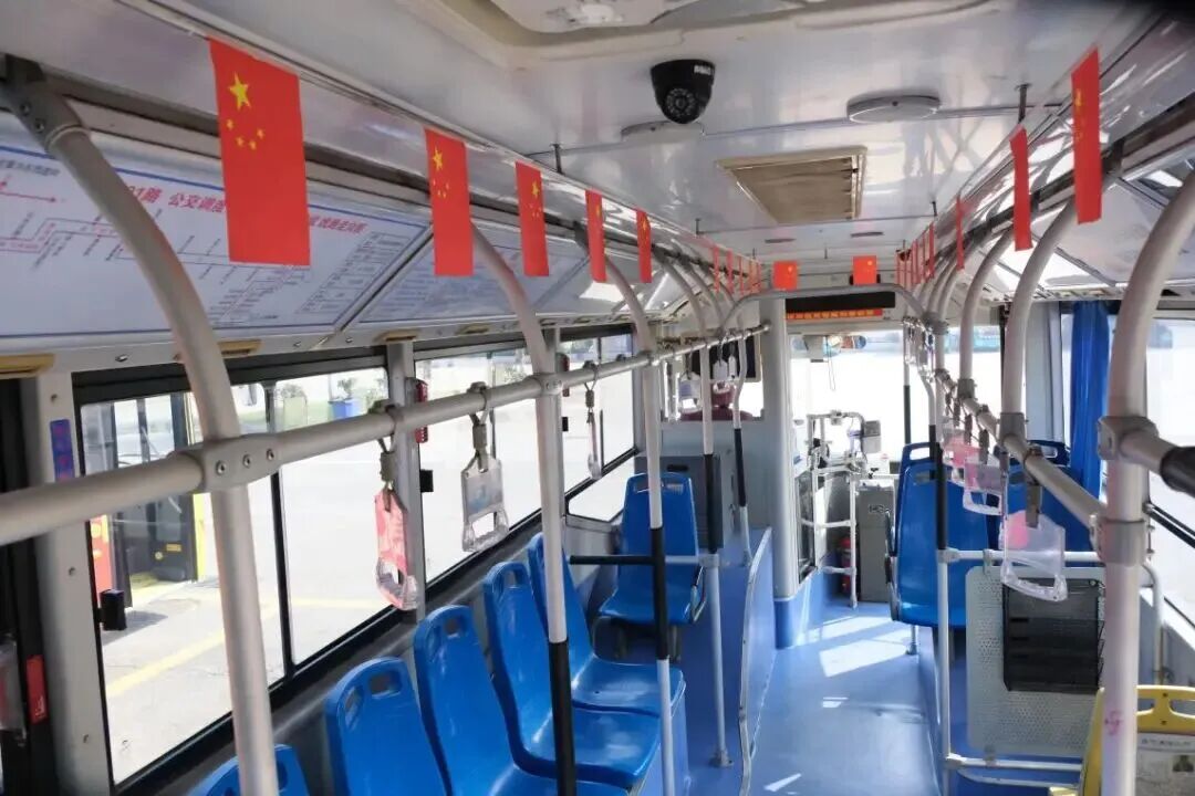 节日的车厢里,随处洋溢着浓重的喜庆气氛。。301路公交车厢内,车顶两侧整齐悬挂着鲜艳的五星红旗,微风拂过,红旗轻轻摇曳,乘客们刚踏上车厢,眼光便被这抹亮眼的中国红吸引,孩子们指着红旗兴奋地向家长提问,车厢内全是欢声笑语,节日的幸福感在流动中一直转达。。