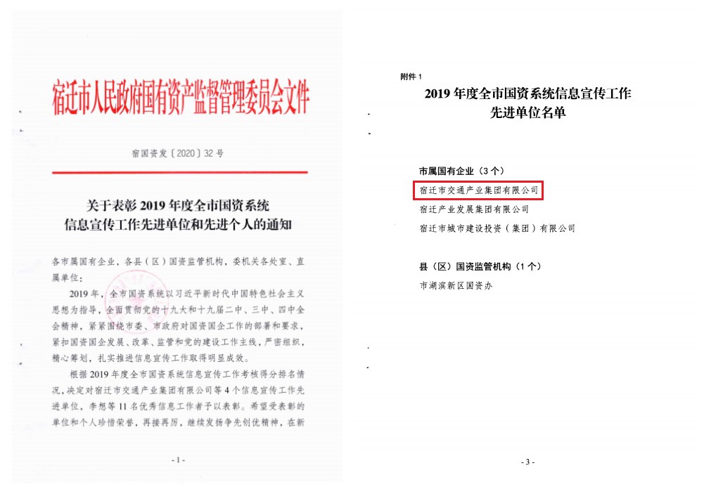 克日,,,宿迁市国资委宣布《关于表扬2019年度全市国资系统信息宣传事情先进单位和先进个人的通知》,,,市百乐博集团以审核得分排名第一的好效果,,,荣获2019年度信息宣传事情先进单位。。