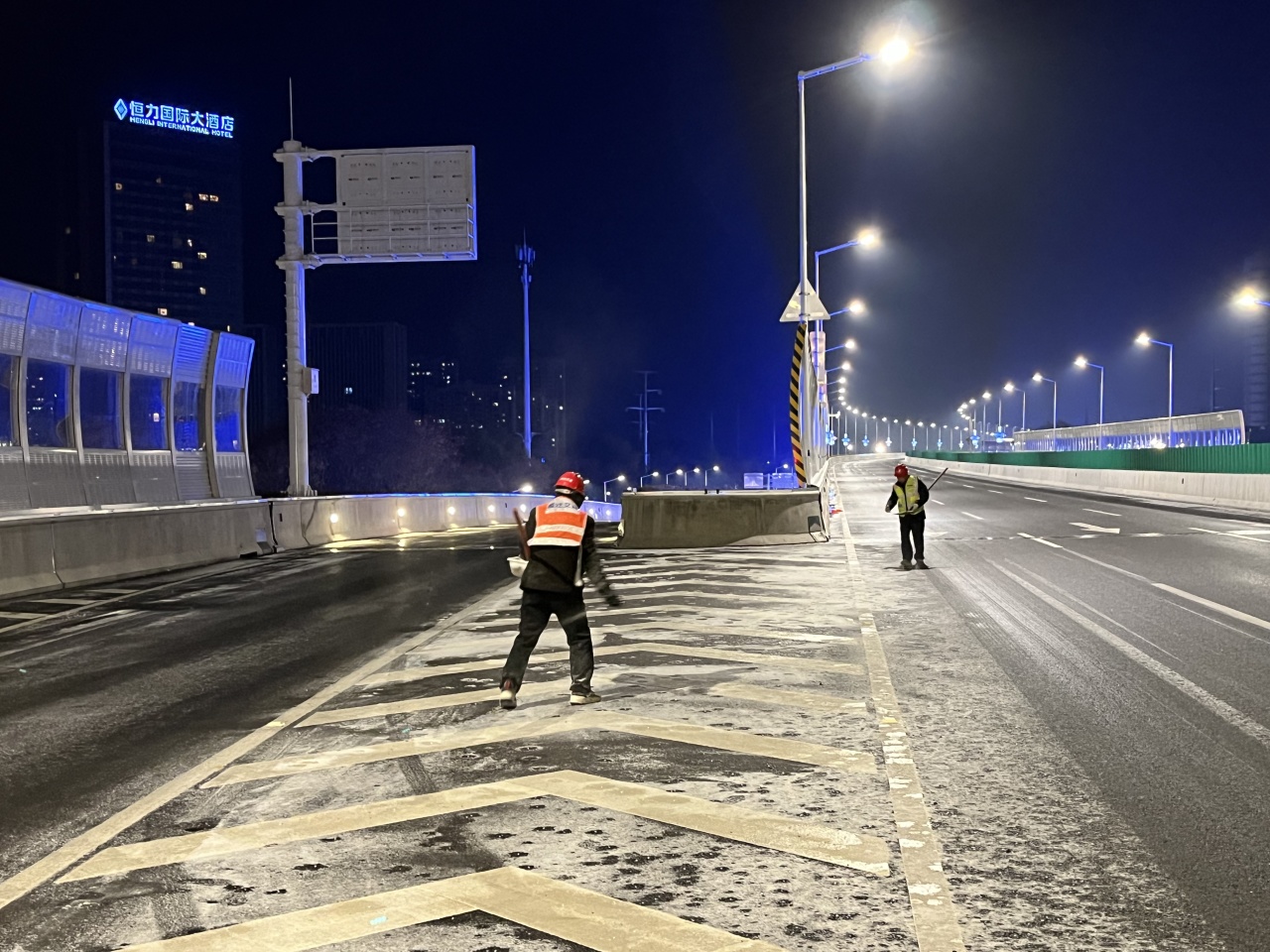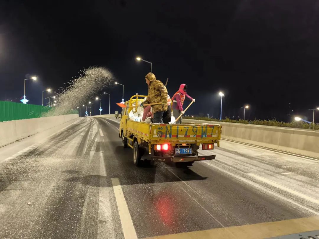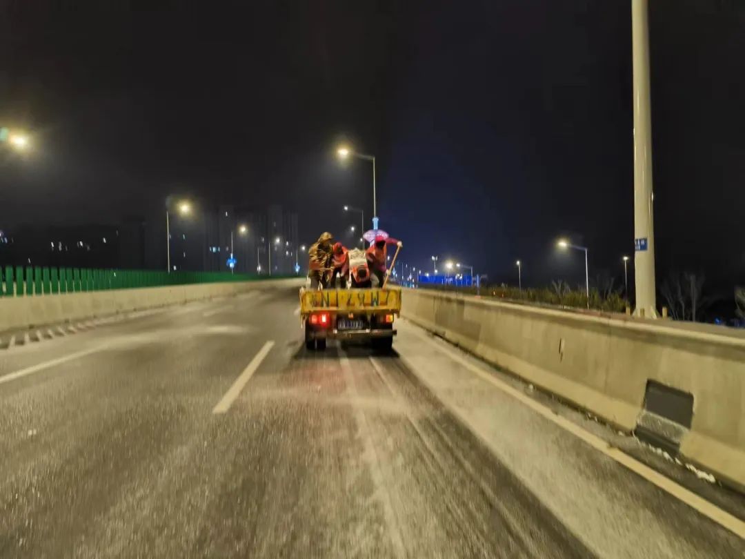 高铁公司连忙启动应急预案,组织养护单位迅速至北京路、迎宾大道二期、洋河大道、上海路等路段开展融雪除冰事情;同时,联合市公安局铁骑大队互动巡查,确保蹊径清静流通。宿迁交建蹊径养护党员突击队第一时间上路,通过撒布融雪剂、融雪盐和摆放防滑料,实时破除清扫结冰、积雪路段。