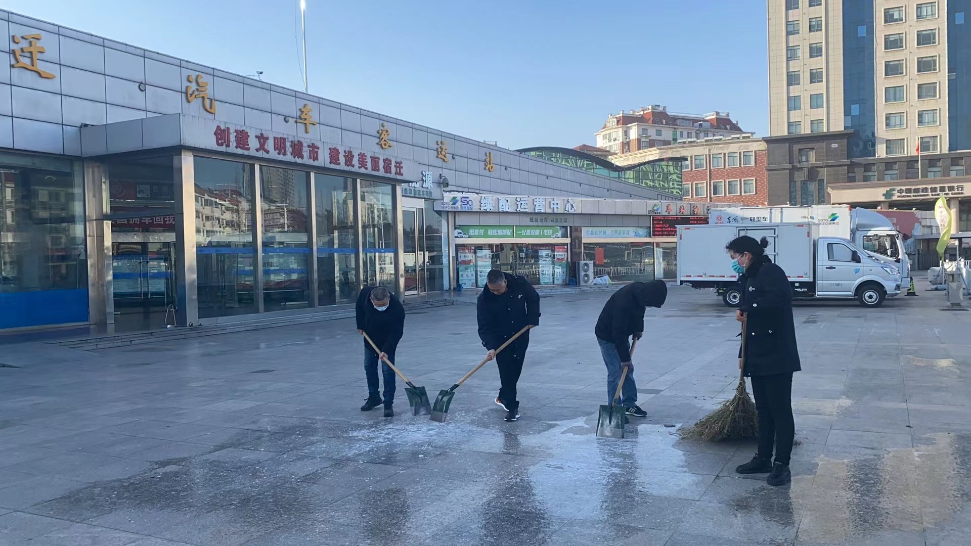 宿迁汽车客运站本着“提前预防、快速反映、坚决处理”的原则,组织站务职员开展站前广场除冰融雪,重点清扫广场积雪成冰地段,防止游客摔倒、滑倒;安排专人提前开展路面监控,排查车辆通行难题路段,强化车辆状态实时监控,对驾驶员举行清静提醒,全力包管游客出行清静。