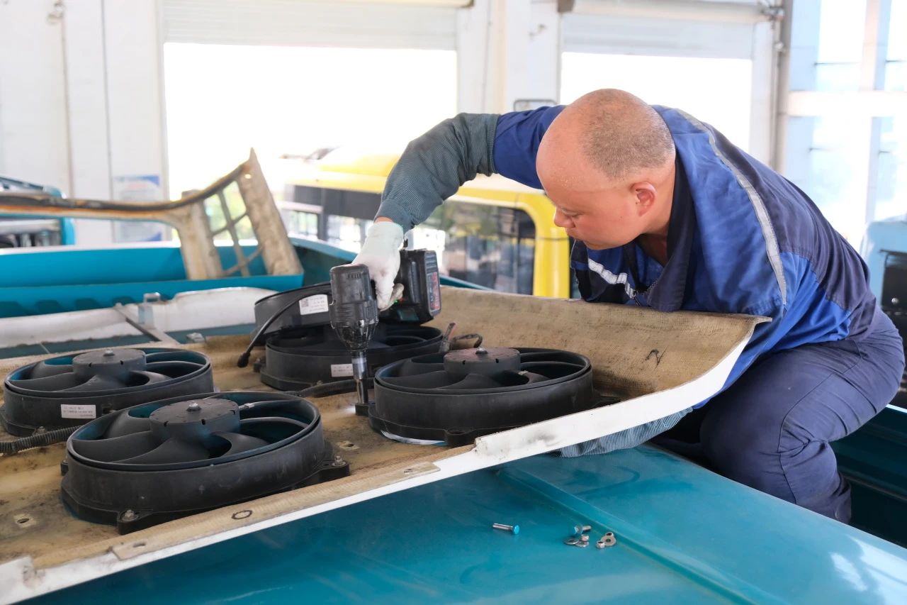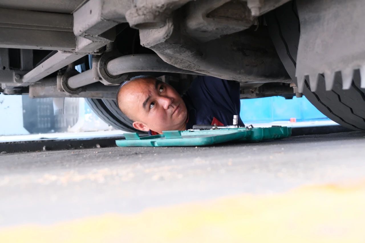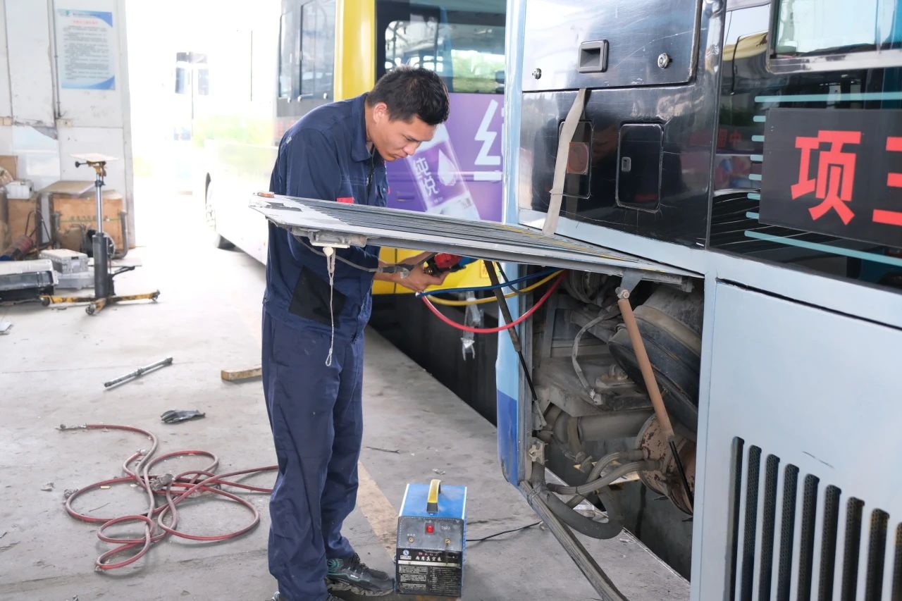 上午10点,,阳光已经变得格外“狠毒”,,走进维修车间,,一股混淆着机油、、橡胶和热浪的灼热气息扑面而来。维修车间内,,温度高达40℃以上。刚驶入车间的公交车引擎盖下,,温度更是靠近60℃,,站在旁边都能感受到热浪滔滔。维修工赵贺贺师傅正钻在公交车底部,,对车辆的底盘举行检查,,深蓝色的工装早已被汗水湿透,,紧贴在背上。“发念头刚停机,,温度有70℃以上,,手不可触碰。”赵师傅抹了把脸笑道,,“但再热也得修,,不可让一辆‘病车’上路。”