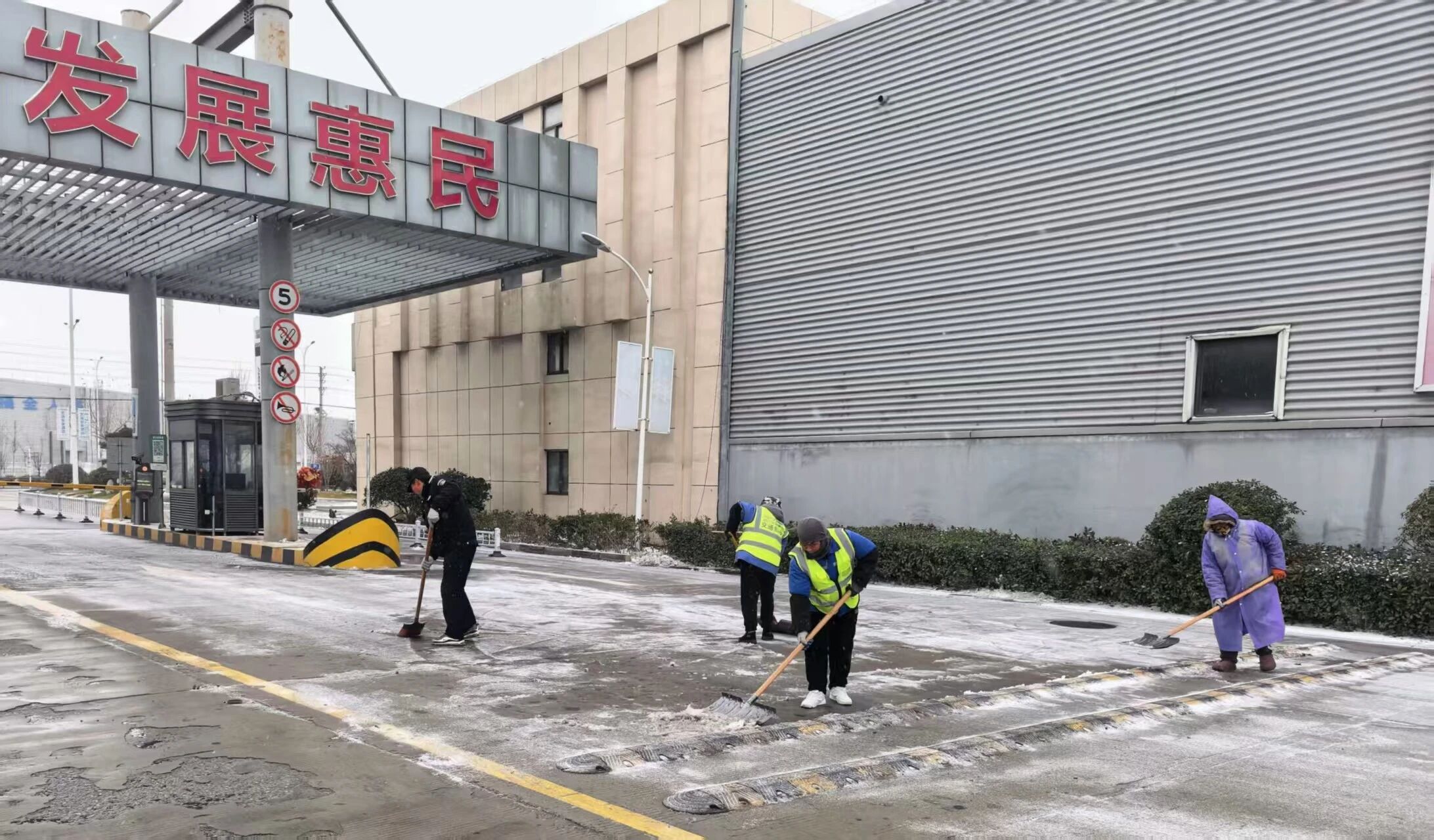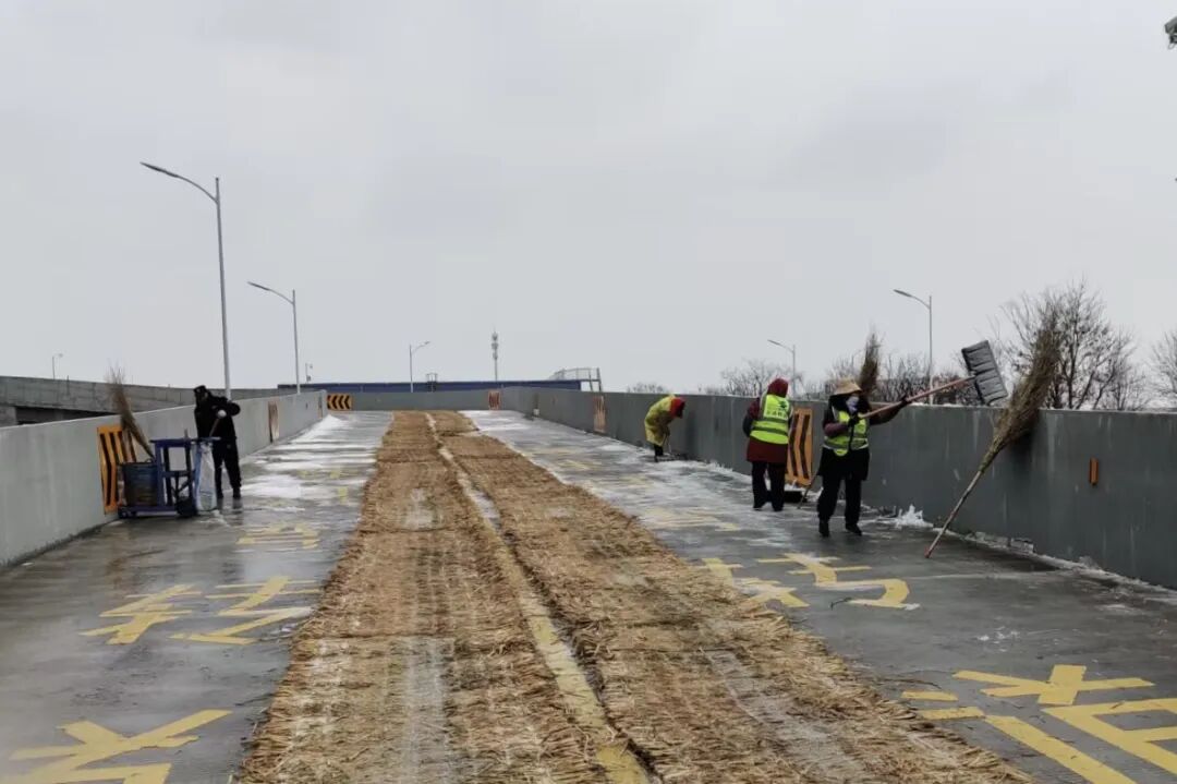 通湖物流园对内部主干蹊径、、仓储区域等处,,,撒好除雪剂并举行融雪、、除雪,,,在客栈收支口、、坡道等易滑区域铺设防滑设施,,,通过微信群、、广播等渠道,,,向租户转动宣布天气预警与清静提醒,,,全力减轻寒潮影响,,,包管园区平稳运行。。。