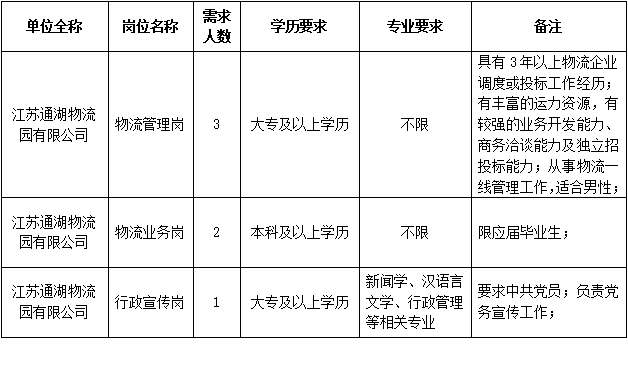 ½ËÕͨºþÎïÁ÷Ô°ÓÐÏÞ¹«Ë¾ÊÇÒ»¼Ò´ÓÊÂÎïÁ÷ı»®ÓëÖÎÀíµÄ¹úÓÐÆóÒµ£¬ÎªÖª×ãÓªÒµ¿ªÕ¹ÐèÒª£¬ÏÖÃæÏòÉç»á¹«¿ªÕÐÆ¸Ò»ÅúÀÍÎñÅÉÇ²ÖÆÖ°Ô±¡£¡£¡£ÏÖ½«ÓйØÊÂÏîÐû²¼ÈçÏ£º£º