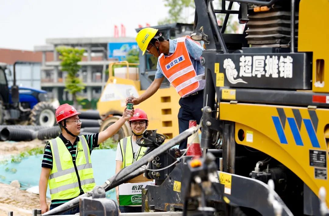 上海路(高铁站毗连线)刷新工程的桥梁较量多,对路面摊铺的细腻化要求较量高。。为了提高摊铺平整度,周大松自动与施工队认真人、、、手艺员交流,配合刷新施工步伐,最终确定以钢丝网法举行摊铺。。